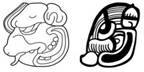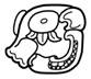 · Do not confuse this with the visually (slightly) similar HE’EW = “noun classifier for days”. HE’EW has a mammal head (sometimes) with crossbones over the eye (and with no trilobate nose), whereas K’EK’EN has a mammal head with a trilobate nose, with a trilobate element under the eye, with the leaves pointing downwards.