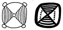 Subvariants (2) · A. Symmetric: o A knot in the middle. o On each side of the knot, trailing, slightly curved, parallel bands. o Each of the two groups of bands ending in two curved tassels. · B. Asymmetric: o Top: two curved L-shaped bands, with two crossed bands between them; the crossed bands can optionally have spines or reinforcements. o Middle: the two curved L-shaped bands end in a washer (optionally bold centre). o Bottom: two or three spiral- (i.e., “feeler”) or leaf- or tooth-shaped tassels. · Curved: 2-3 dots on the inner side of the outer reinforcement. (What does this mean?)