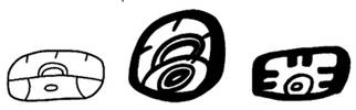 · Features: o A boulder outline with a “washer”-like element in the middle of the bottom. · Subvariants (3): o A. “Whiskers”: § Semi-circular arc, higher in the middle than at either end, dividing boulder into a top and bottom half. The arc usually doesn’t have that much curvature (ends quite far apart), but can sometimes be so curved (end close together at the bottom of the glyph) that it resembles a “washer”. § In the bottom half of the glyph: · Two touching dots attached to the upper side of the arc, in the middle. · The above two elements forming an element resembling a “wood property marker”. · Optionally, the two touching dots can have a “protector” (TOK.p15.r1.c2, 1556st). · Optionally, the two touching dots with “protector” can degenerate into just a “grip”/ “inverted-u bracket” (MHD.XN3.1&2). · Optionally, the two touching dots can disappear (MHD.XN3.3). § In the top half of the glyph: · 2 parallel ticks on the middle of the left wall (9 o’clock). · 2 parallel ticks on the middle of the ceiling (12 o’clock). · 2 parallel ticks on the middle of the right wall (3 o’clock). § MHD.XN3.1&2 are Classic and MHD.XN3.3 is Codical, which shows that the “whisker” variant existed in the Classic period and survived into the Post-Classic. o B. “Wavy bands”: § A “washer” in the middle of the bottom. § From the washer, two slightly wavy bands emerge at about 11 o’clock and 1 o’clock, optionally tapering very slightly as they diverge upwards to touch the ceiling at about 10 o’clock and 2 o’clock. § The MHD examples suggest that MHD.XN3.4 is Codical only. · Possibly, the ends of the curved arc of the Classic form got closer and closer together at the bottom of the glyph resulting in the “washer” (already happening in the Classic period). · That “washer” became the only form in the Codices. · It’s interesting to speculate whether the two touching dots of the “wood property marker” elongated into the wavy bands (unlikely?) – they form a pair and both forms occupy the same “position” in the glyph. · Do not confuse the boulder-variant of te with the flint variant of su as they both have “whiskers” (short ticks): o te has “whiskers” in the top half only (at 9 o’clock, 12 o’clock, and 3 o’clock on the perimeter of the boulder outline), whereas su has “whiskers” at both the extremities of the flint outline. o te has only two “whiskers” wherever there are “whiskers”, whereas su has three or more “whiskers”. Also, te has a tendency to have a boulder outline, whereas su has a tendency to have a flint outline (though there are subvariants of su with a boulder outline as well). · Do not confuse the boulder-variant of te with lo: o te has “whiskers” in the top half (at 9 o’clock, 12 o’clock, and 3 o’clock on the perimeter of the boulder outline) o lo has no “whiskers” at all.