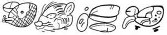 · Do not confuse this (visually and semantically) with CHITAM, which also has a trilobate nose and also means “peccary”. The distinguishing characteristic for K’EK’EN / KEKEN is the “reduced variant of ja” in the bottom right and (optionally) a washer with trilobate element covering the eye (leaves pointing downwards) whereas CHITAM has a horizontal line through the middle of the eye line.